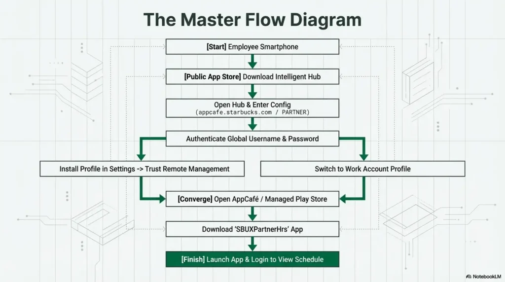 The Workspace ONE Intelligent Hub: Because the app is not public, you must first download an MDM (Mobile Device Management) platform called the Intelligent Hub. This hub communicates securely with Starbucks’ internal AppCafé server to fetch your scheduling software.