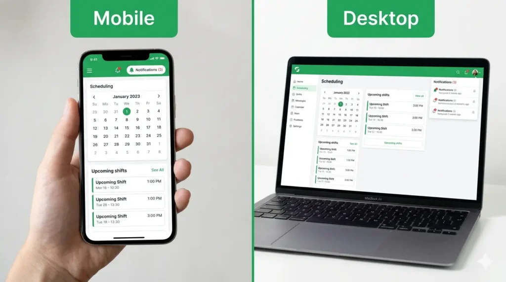 - Mobile Shines for: On-the-go shift viewing, receiving instant alerts, and using the Shift Marketplace