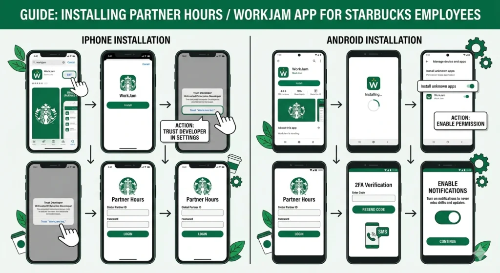 - Search the Play Store: Search for “WorkJam” or “Starbucks Partner Hours.”