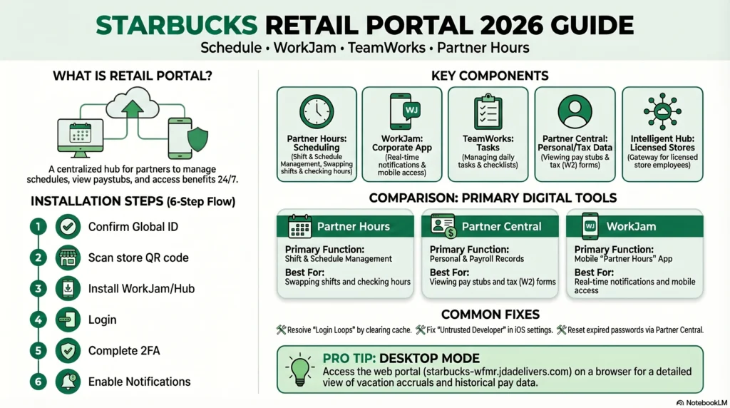 The Starbucks Retail Portal is a centralized web and mobile-based infrastructure designed exclusively for “partners” (Starbucks employees). In 2026, this system has become more integrated than ever, acting as the primary hub for administrative tasks. It replaces old-fashioned paper schedules with a dynamic, real-time interface accessible from almost anywhere.